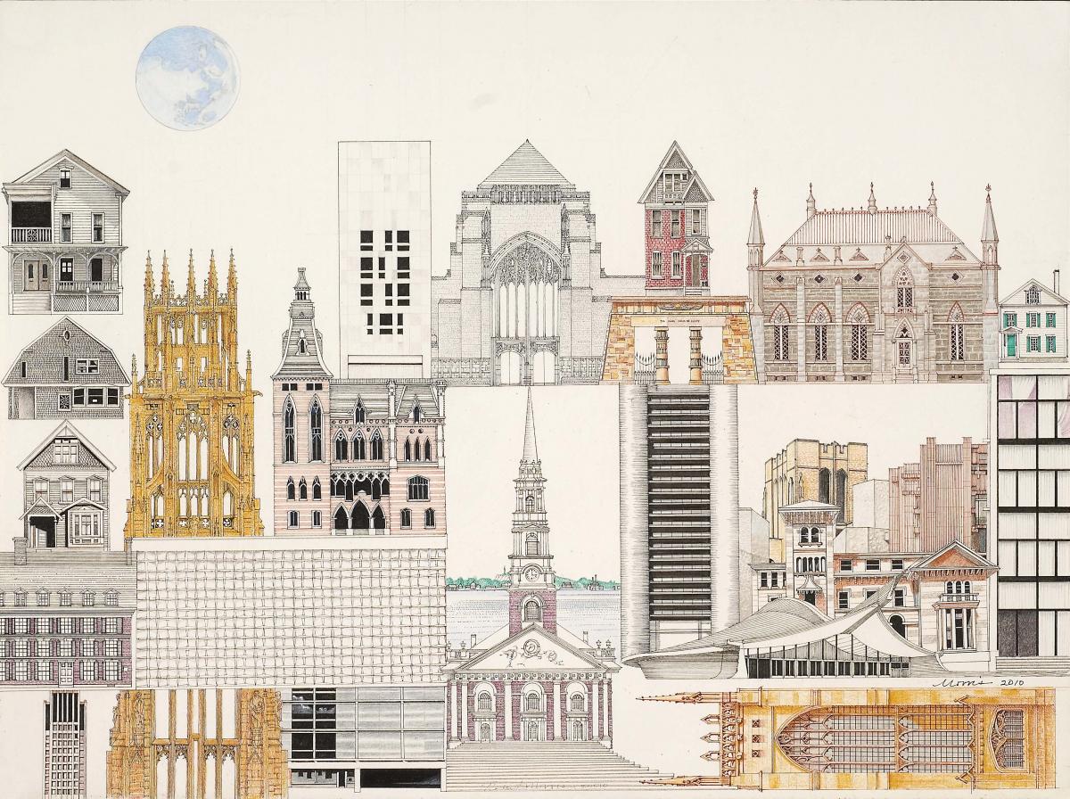 I knew from the start I was not just going to do New Haven. I was going to do piece by piece, putting it together like a puzzle. I started with Harkness tower because it is striking; it was the centerpiece of Yale when I went to school there. It was like a crossword puzzle - where something horizontal might fit into something vertical. I kept on doing vertical and horizontal, where there was an empty space. That is why the Beinecke got to be longer, because I needed something longer to fit in there! Then I got into a few houses, the cemetery, the Green - life, death, education. - Robert Morris